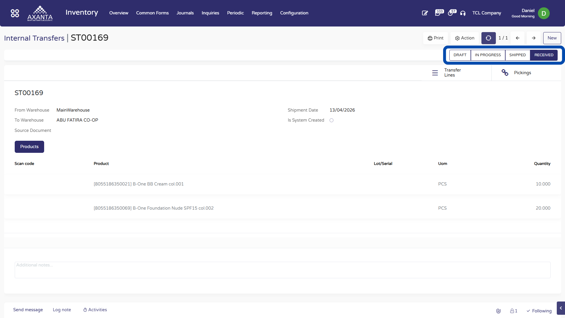 Once Transfer is Posted, the Status gets changed to Received.