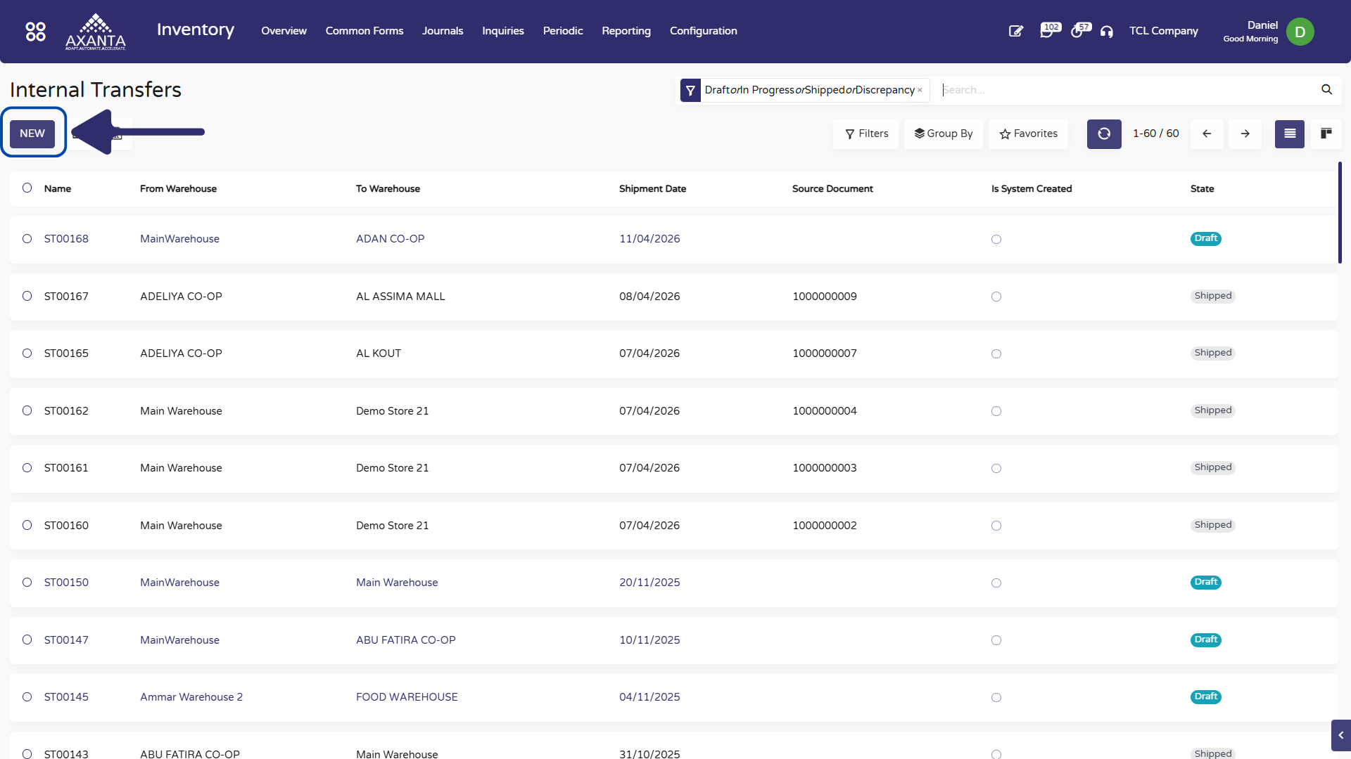 • Navigate to: Inventory → Internal Transfers
