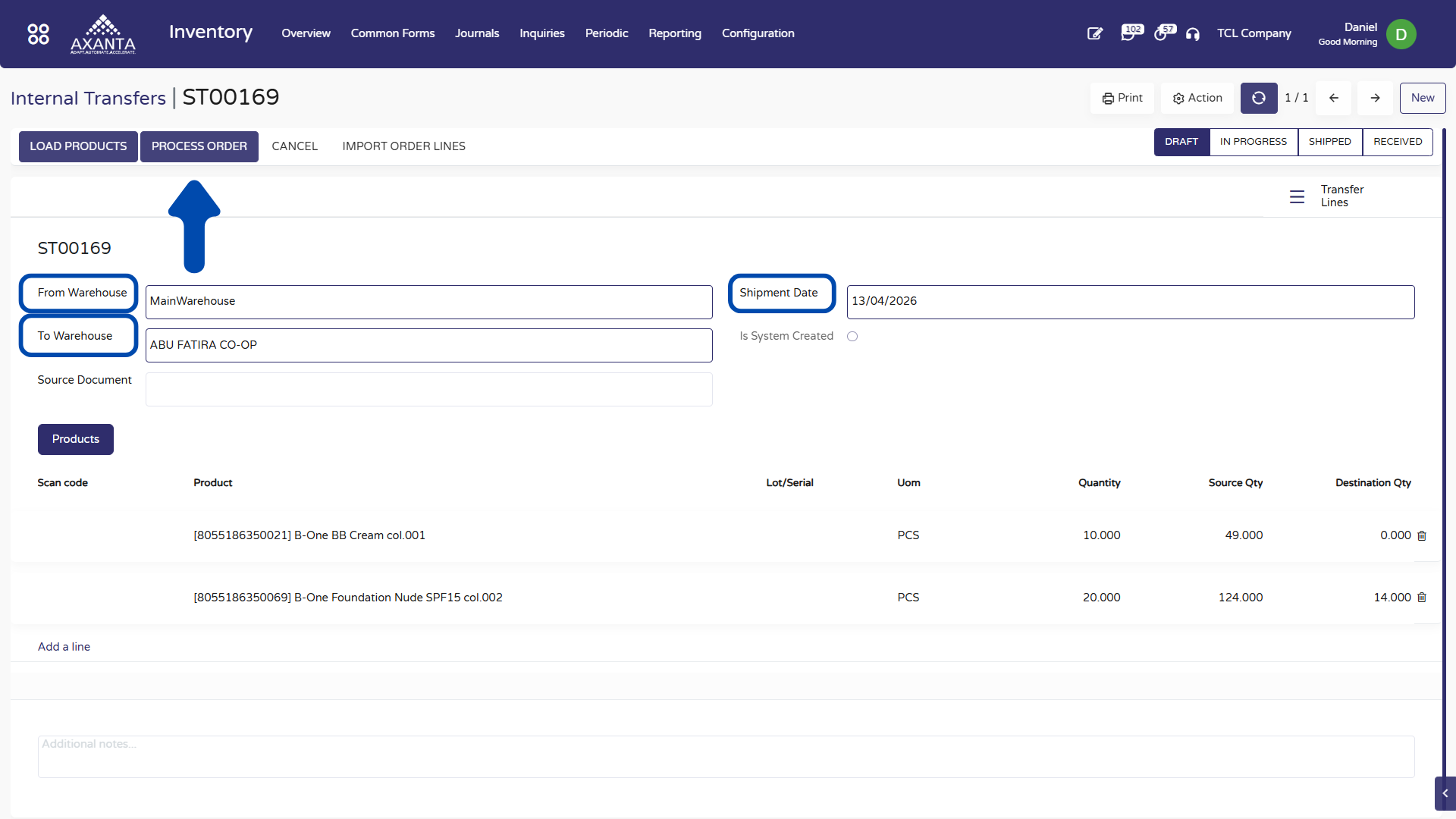 Internal Transfer (One-Step Process) – Ship & Receive Order