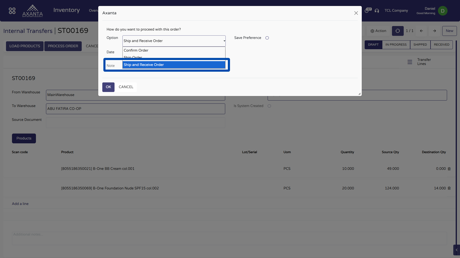 The Ship & Receive Order option allows users to complete an internal transfer in a single step, eliminating the need for separate Delivery and Receipt operations.